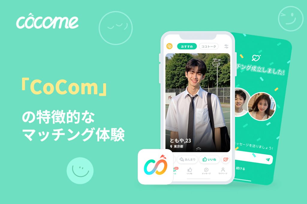 CoCome(ココミー)は、恋愛や恋人探しを目的とした恋活マッチングアプリ。今どきのマッチング事情にしっかり対応したサービスで、AIを活用したマッチング機能や安心できるセキュリティ体制が魅力です。
