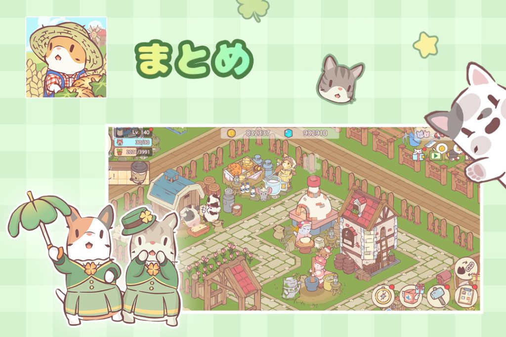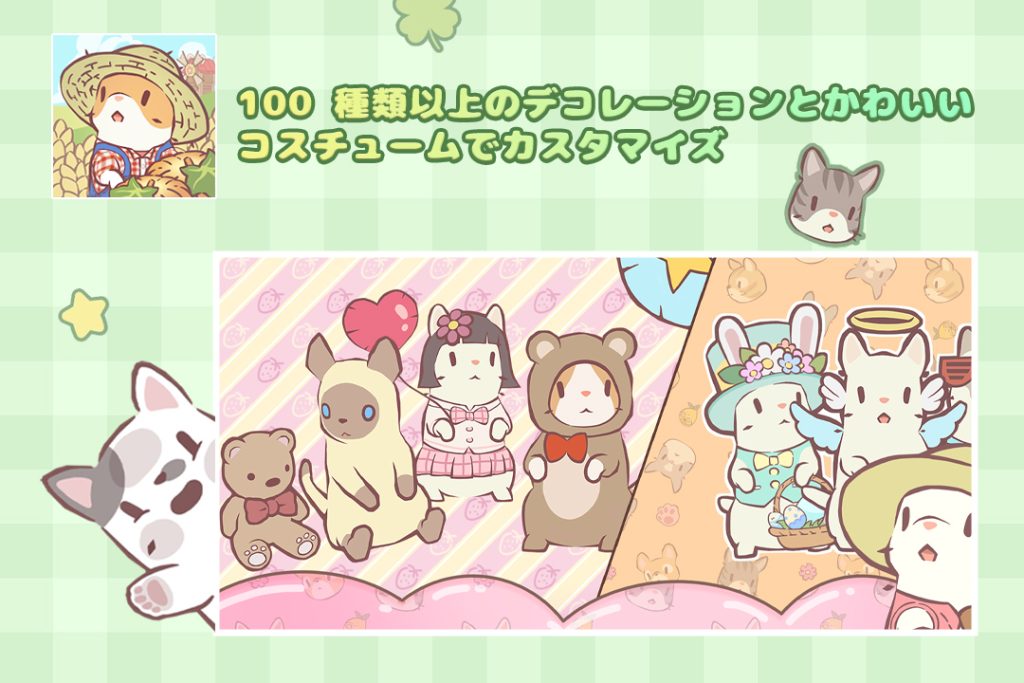 さらに、帽子・服・首飾りなどのかわいいコスチュームでネコたちを着せ替え可能。期間限定アイテムもあり、農場で働くにゃんこたちがより魅力的に見えること間違いなし。